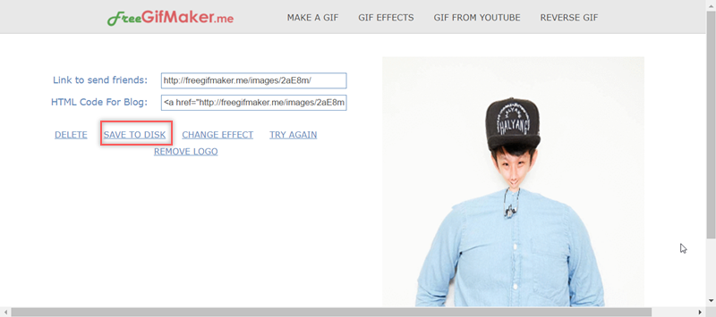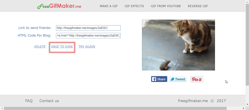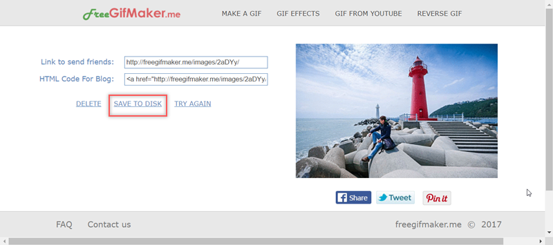 製作完畢會給你兩個連結,上面的可以傳給朋友,下面的可以放進 Blog,也可以點圖片下方圖示上傳到臉書或 Tweet、Pin it,或點「SAVE TO DISK」存檔,完成的動圖網站會存 3 個月,不放心的話下載後就點「DELETE」刪除它。