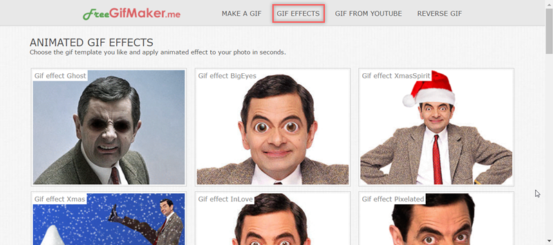再來套用特效,目前提供了 20 幾種特效可套用,然後都用豆豆先生當示範圖(官方還在下面補充:很難找到更有趣的臉來創建 gif 效果...)。