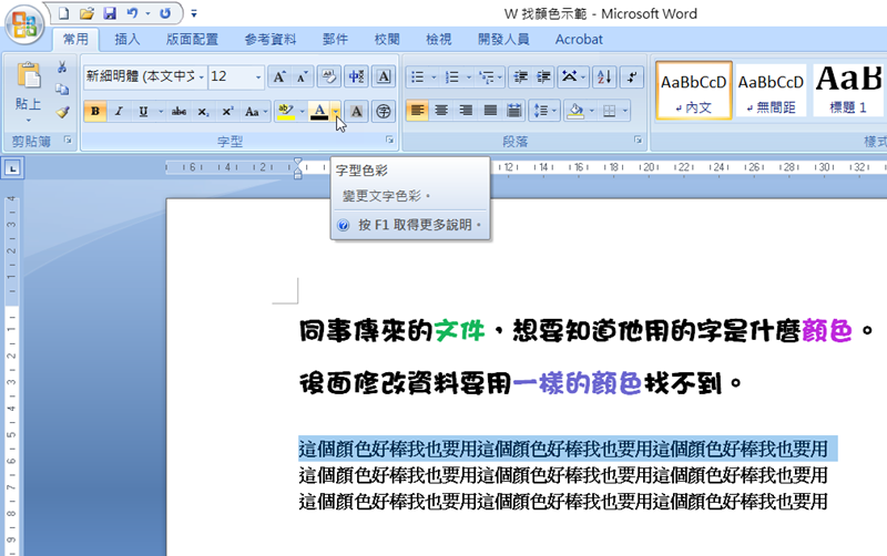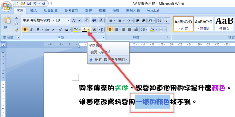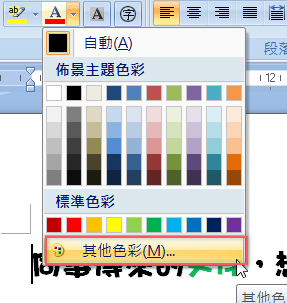 打開 Word 文件,將要使用的顏色反白,到上面打開「A」旁邊的字型色彩選單。