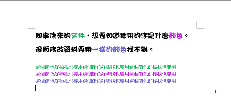 不管有多少特殊色都不怕,阿湯自己用過的顏色也會忘記,短時間的話 Word 會幫你記起來並顯示最近用過的色彩,時間一長就會消除,以後用這個方式找很快就找到了。