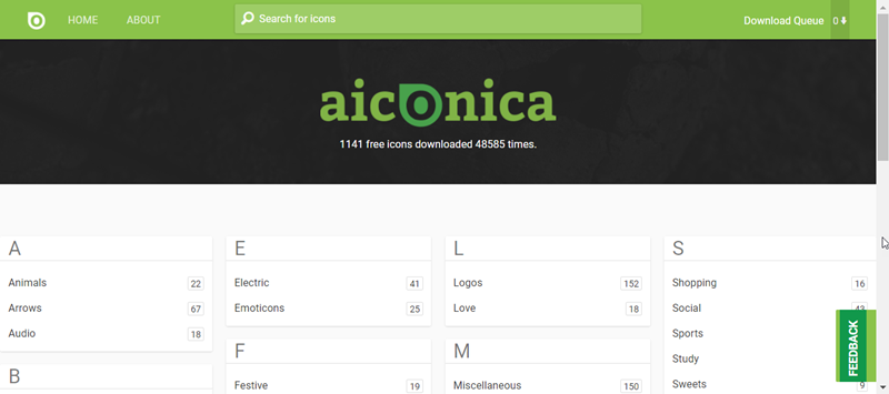 首頁直接將題材類別按字母排列,並在名稱旁加上共有多少素材,整體雖然不多但下載次數蠻多的。