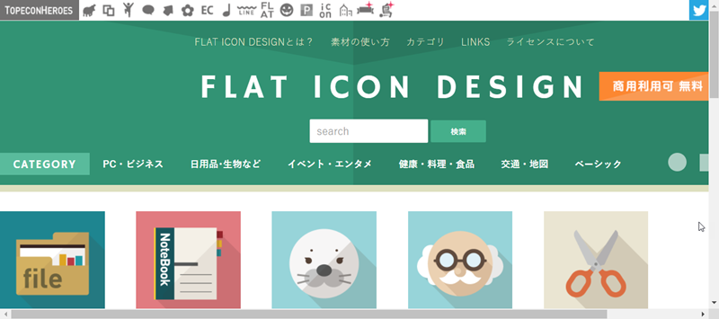 最後來介紹一個日本的網站,這個網站走日式可愛風,都是以扁平化設計的素材,首頁一樣可搜尋或從類別進入。