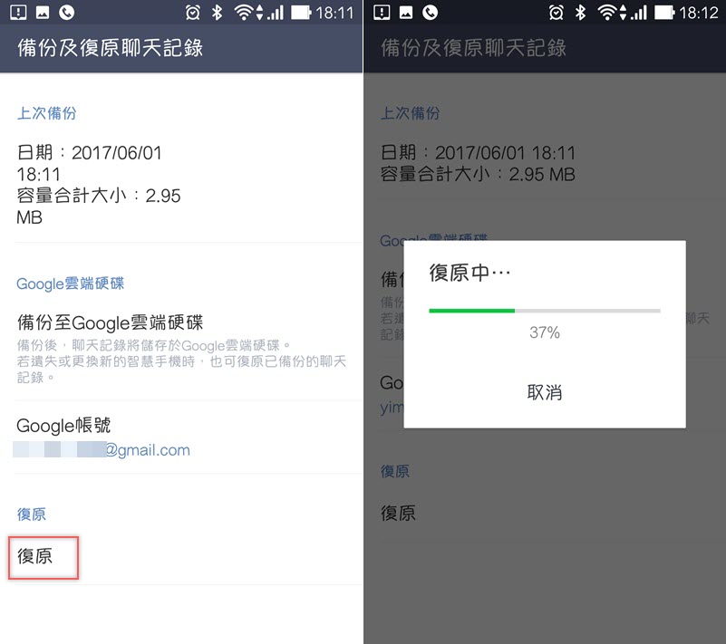 雖然 Line 官方說目前只有文字記錄能備份,但昨天上線的功能今天阿湯連圖片、影片都可以正常看到了,不過以防萬一重要的檔案還是先存好,官方還說沒限制手機類型,只要 Android 2.1 以上的版本就有支援這個功能。