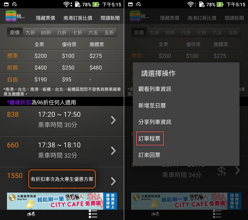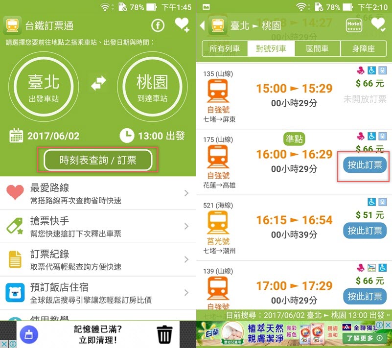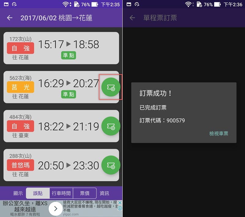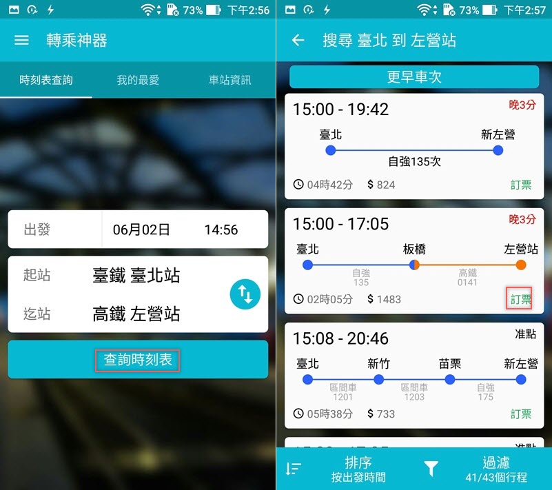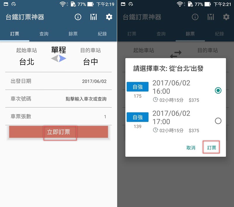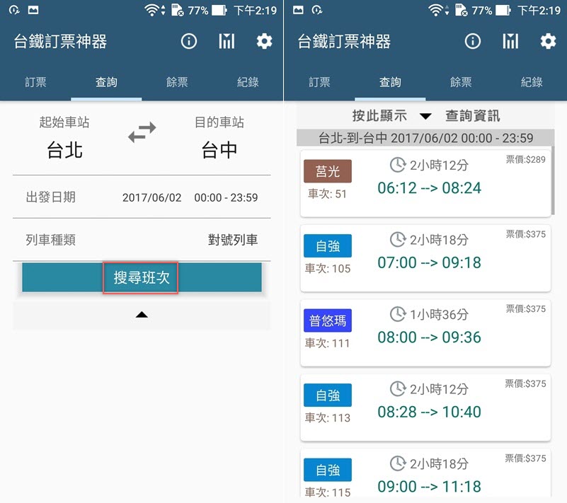 查詢後可選擇票價和艙等,下面也會直接顯示車次,點進去後除了訂票還可記錄與分享資訊。
