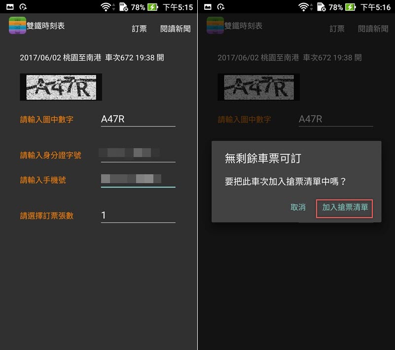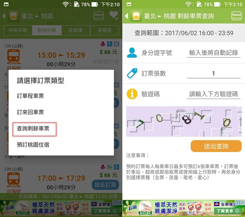 也能從餘票查詢區搜尋剩餘車票後再開始訂,一樣選好要坐的車並輸入身分證字號。