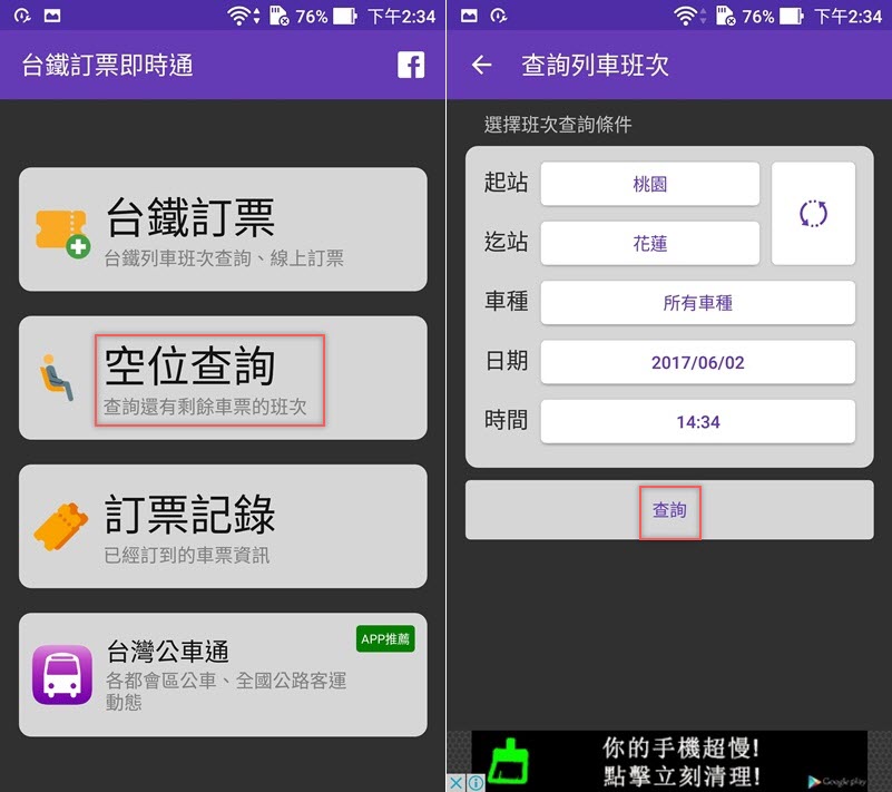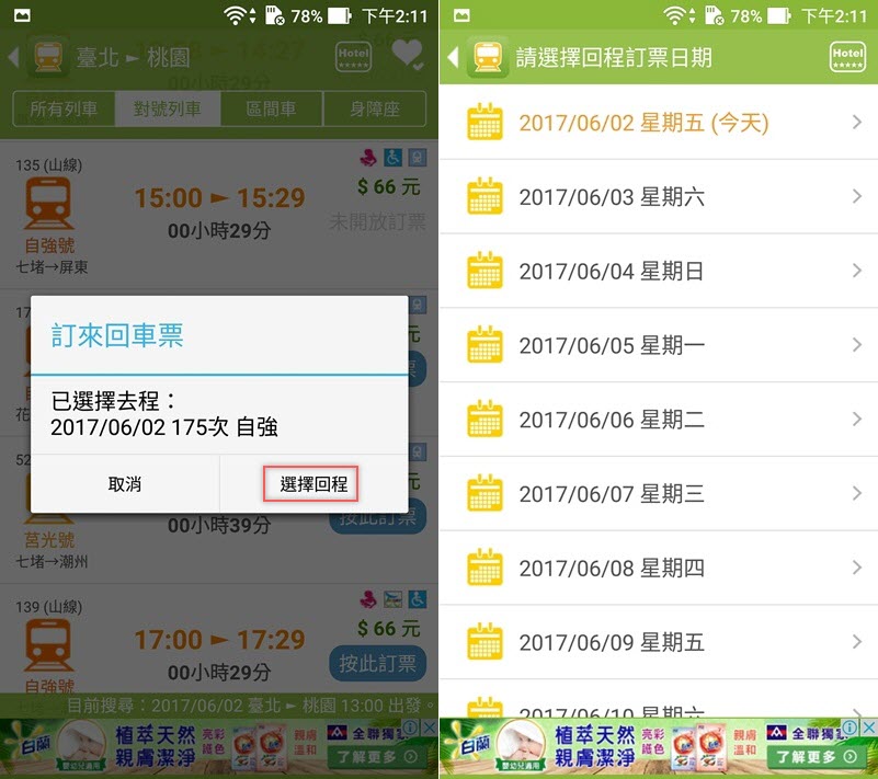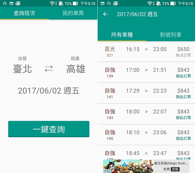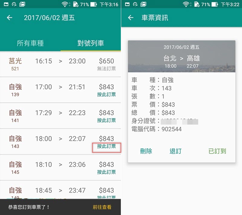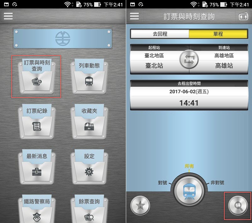 跟上面的台鐵訂票通是同一個開發商,介面和使用方式都一樣,點查詢後擇一定票即可。