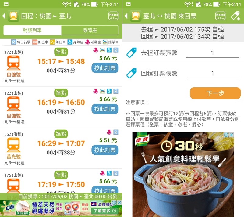 看要訂單程、來回還是查剩餘車票,並輸入資料送出,如果點預定住宿會連到訂房網站,還蠻方便的。