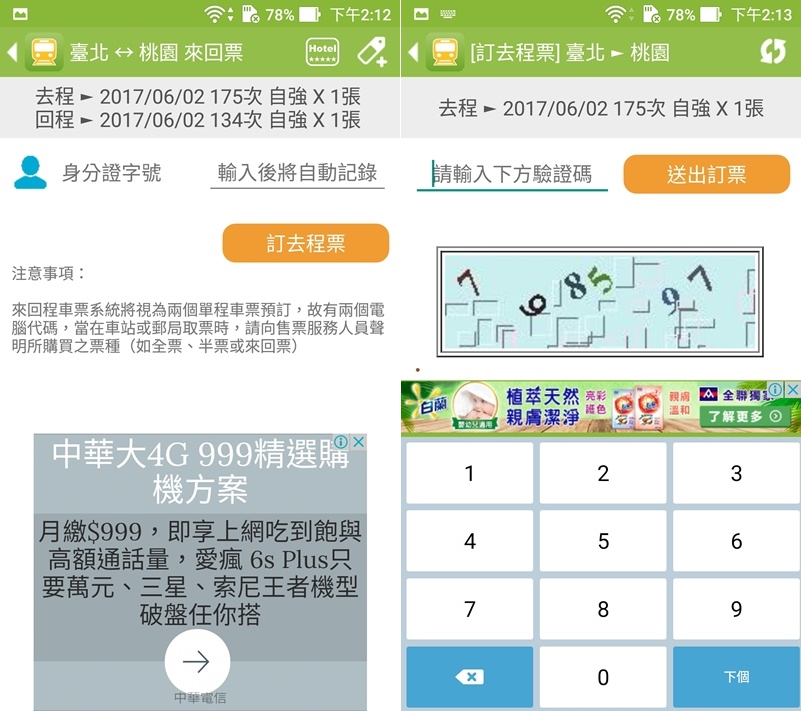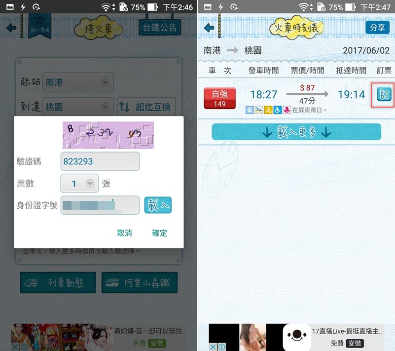 可以切換到對號列車區,點訂票後一樣要經過驗證才可以訂,但速度真的挺快的,也不容易眼花。