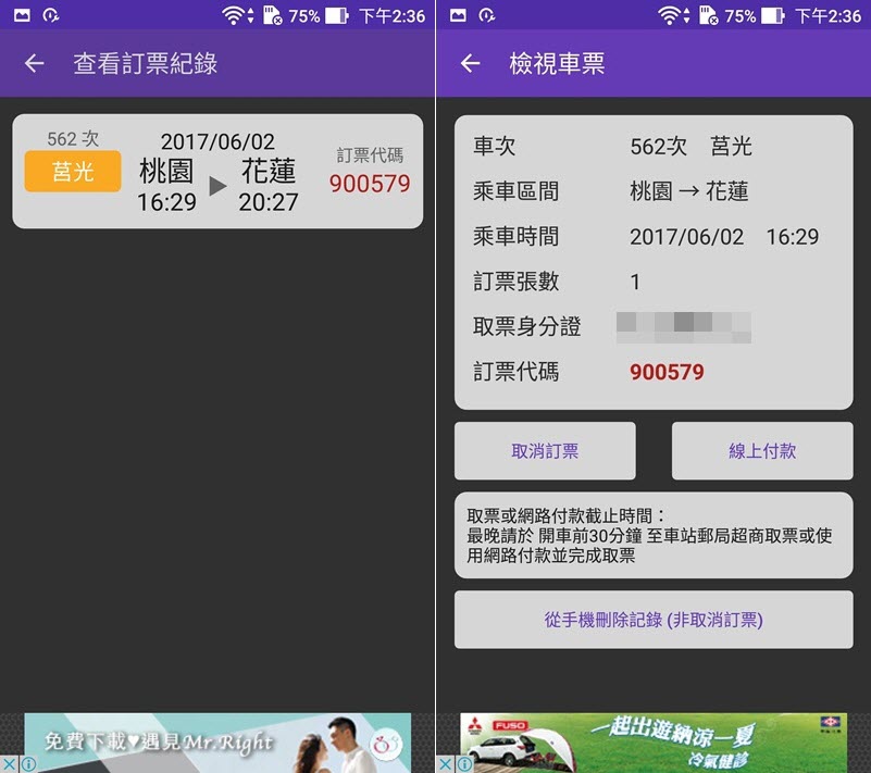 最後也是可以線上付款,或者前 30 分鐘到車站或超商領票。