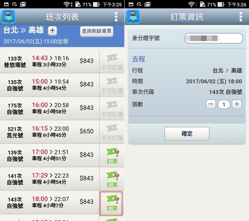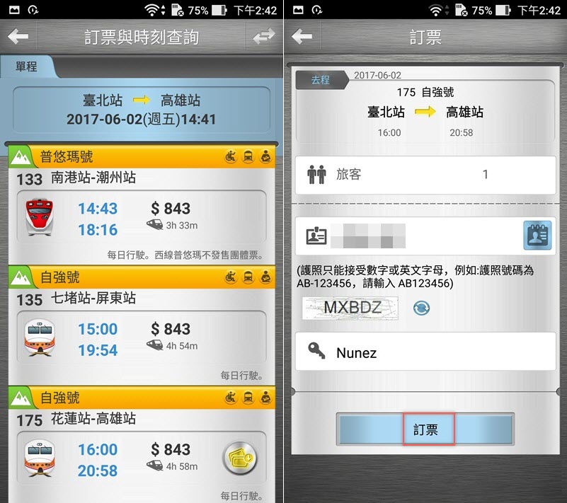 顯示的資料也很詳細,還有車頭圖示不怕選錯,點進去再輸入身分證字號即可訂票。