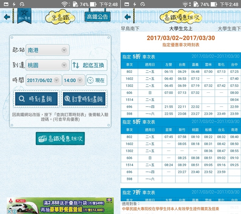 高鐵的部分除了直接設定條件來查,也可以點下方「優惠班次」進入,但發現只有顯示大學生的優惠資訊,而且只到三月底已過期。