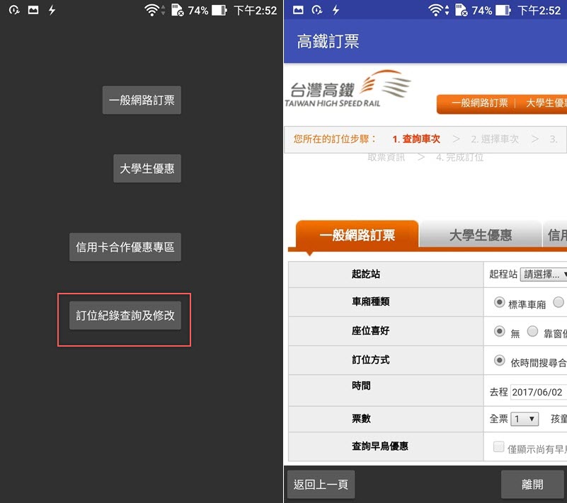 嗯,這個 APP 只是提供介面,大學生優惠、信用卡優惠、紀錄查詢這幾項點進去,都會連到高鐵官網,如果覺得這樣比從網路進官網還快的話就可以下載。
