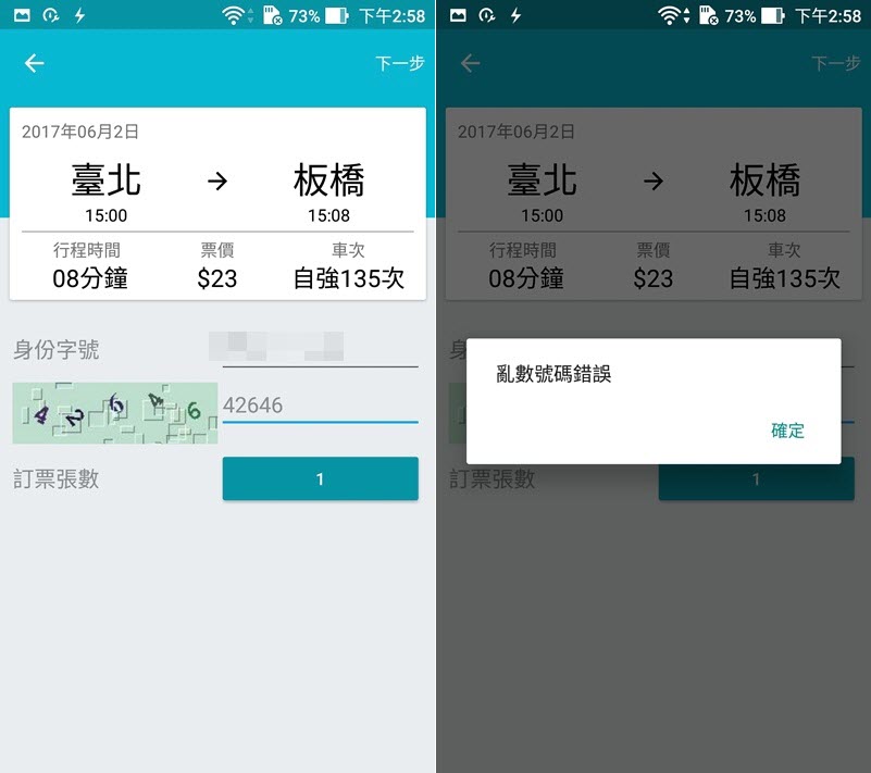 確認後一樣進行驗證,但阿湯試了三次不同的驗證碼點下一步後都跟我說「亂數號碼錯誤」,沒辦法訂。