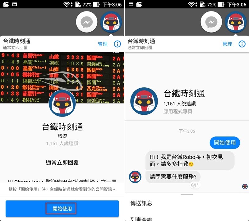 這個比較特別是用 Messenger 跟台鐵 NPC 聊天的方式,看要查車次資訊或訂票都會迅速回覆你。