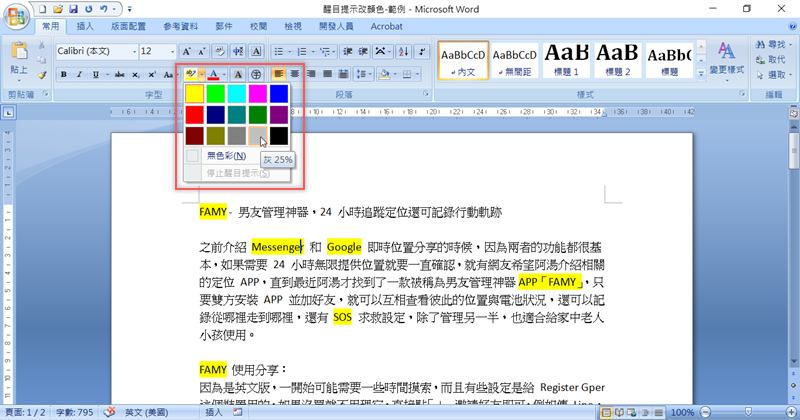 打開 Word 檔,假設這些重點文字已經都畫好黃色了,但是不喜歡想換個顏色,先點開醒目提示旁的清單,選擇要換的顏色,假設是灰色。