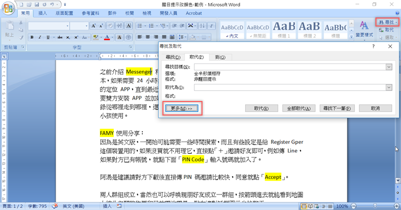 選好之後到右上角「尋找」點開,出現「尋找及取代」的視窗,點下方「更多」。