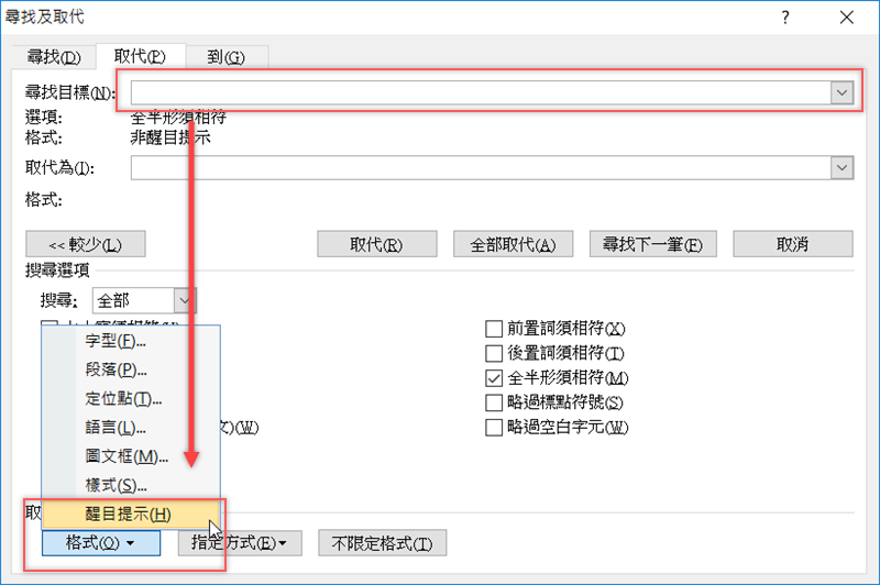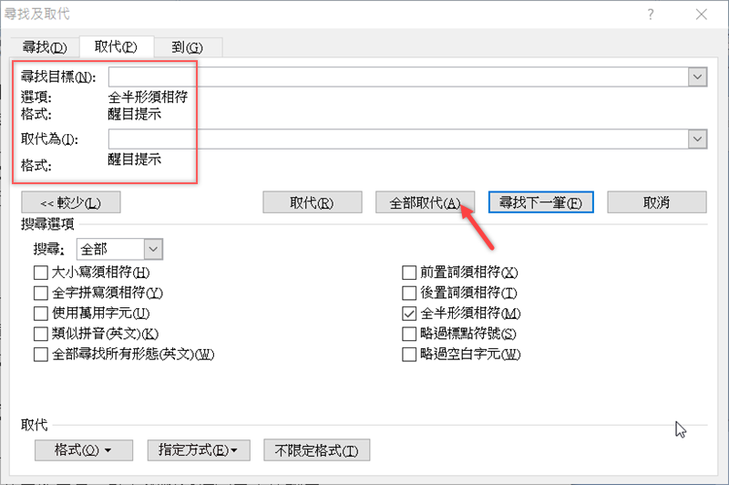 用同樣的方式,在「取代為」的空白行點一下,一樣到左下角選「醒目提示」,確認好紅框內容都已更改,就點「全部取代」。
