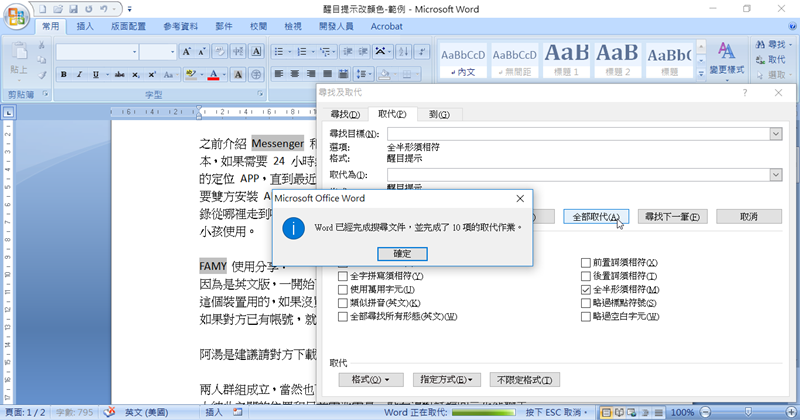 因為畫螢光筆的內容不多只有 10 個地方,所以很快就完成取代的動作,從左邊就可以看到文件中原本黃色的部分都改成灰色了,很簡單吧。