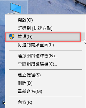 以 Windows 10 系統為例 ,在桌面「本機」的圖示按右鍵,選擇「管理」。