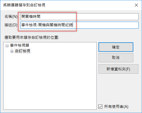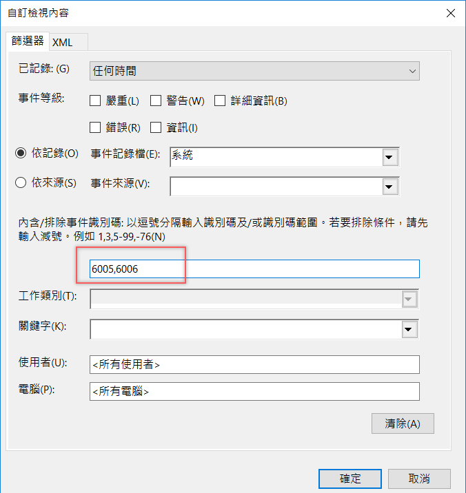 在內含∕排除事件識別碼空白列,輸入開機事件代碼「6005」、關機事件代碼「6006」,如果是給所有人那「所有使用者」和「所有電腦」就不用更改,點確定。