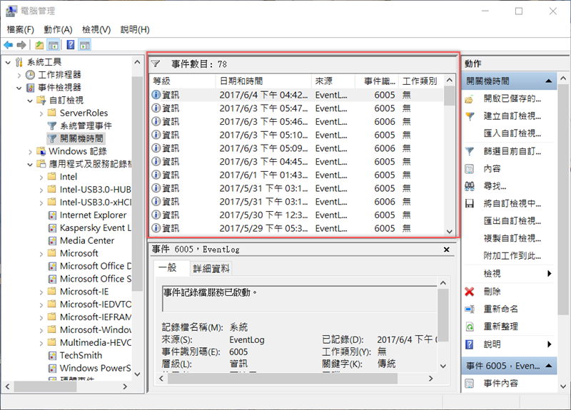 事件紀錄檔服務已啟動,可以看到目前有 78 個事件。