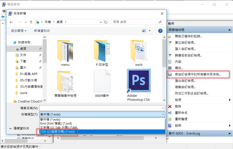 也可以存成 CSV 檔方便在 Excel 中查看,一樣在右邊點「將自訂檢視中的所有事件另存為」,再將檔案類型選擇 CSV 檔即可。