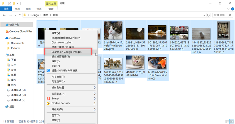 安裝完成,假設阿湯下載了一堆寵物圖片想找來源,就將它們全選後按右鍵找到「Search on Google Images」。