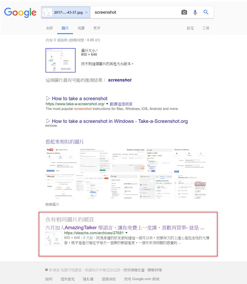 這次阿湯用網站裡放的截圖來搜,辨識出是螢幕截圖所以查到的也是一些不相關的截圖畫面,重點是在最下面找到「就是教不落」的同一篇文章,算是有準確找出來源。