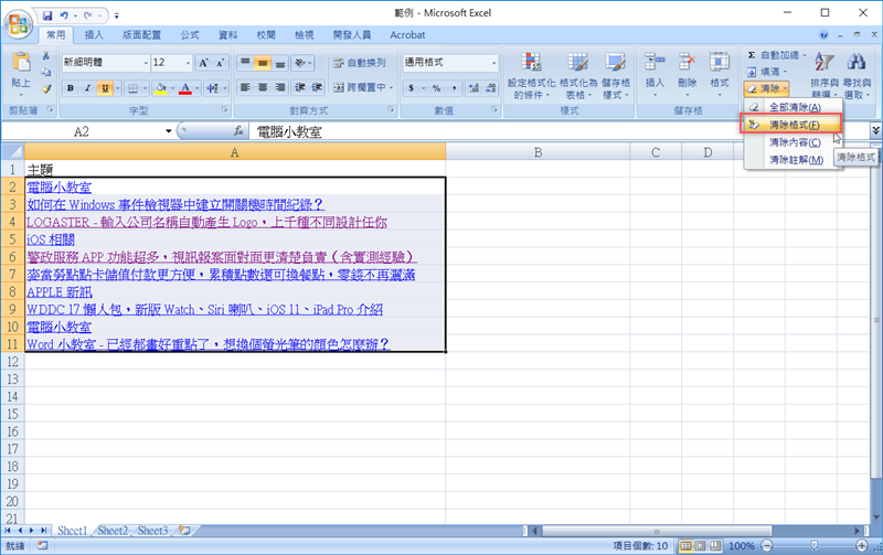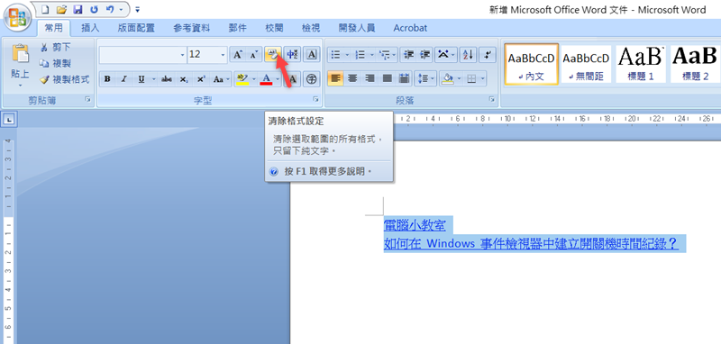 Word 裡就更簡單,一樣在常用頁籤找到橡皮擦,一點就清除了,不同的是清除後來藍字和底線還在,如果要變回普通文字要再修改。
