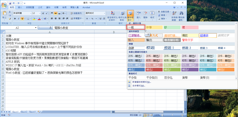 也可以全選後從「儲存格樣式」這裡更改,點「一般」即可,好處是還可以直接修改成其他類型的文字樣式。