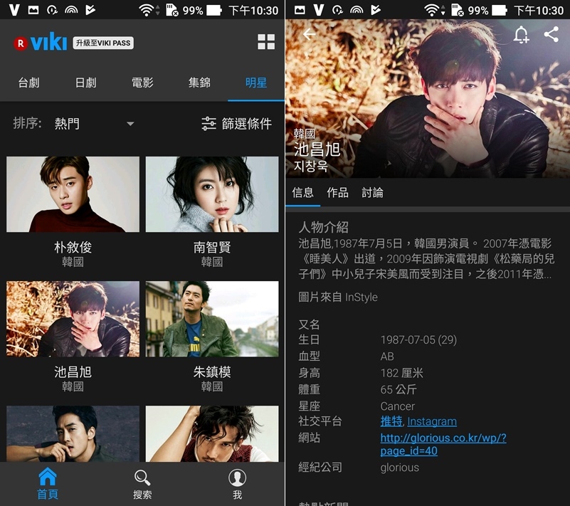 可設定熱門度、評分、時間等排序方式,也可依演員篩選,點進去除了作品集也有個人信息及討論區可查看。