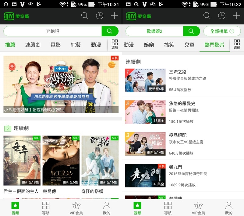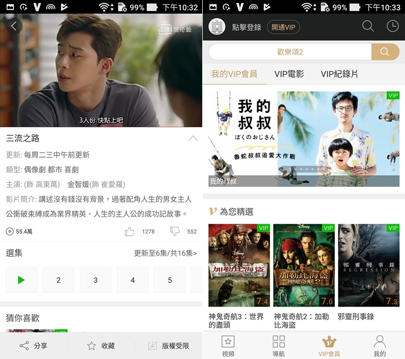 畫質很好,放大播放後還有 VR 模式可選擇,但缺點是大概 60 %以上都要花錢升級 VIP 才能看,不過升級可享受更高畫質和一些少數獨播的劇,阿湯就曾經買過一個月。