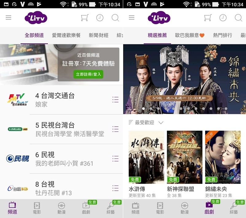 阿湯家的電視盒就是 LiTV 的所以很熟悉,頻道非常多包含有線電視的新聞台、體育台、綜藝都有,註冊有七天體驗期,但阿湯沒註冊也是可以看。