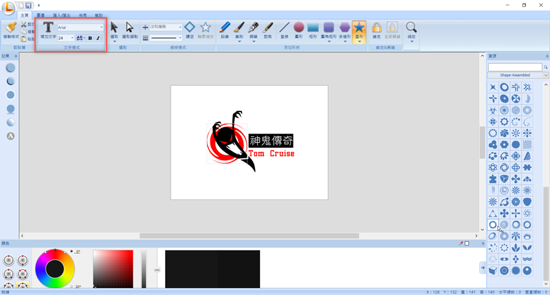 大家都知道阿湯最近演的電影上映了,那就來做個 Logo 吧,先點圖片上字的地方,然後在左上角改字型和大小,底下的形狀也從右邊選個圖案來改,把原先的方塊改成像漩渦這樣。