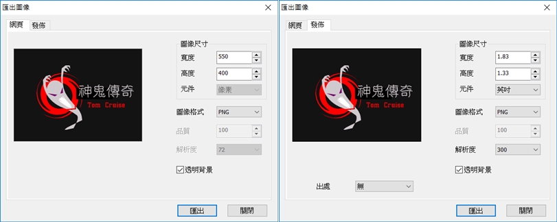 或者選擇網頁(PNG、JPEG),或發布,格式可選 PNG、BMP、JPEG、TIFF 並調整大小、解析度後按匯出即可。