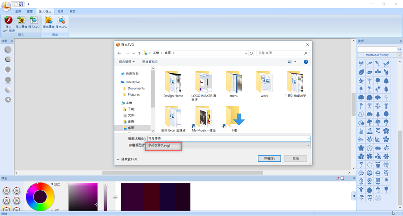 到匯入 ∕ 匯出頁籤,可以看到匯入的部分有 SWF 資源、圖像、SVG 可選,匯出也有圖像和 SVG 可選擇,先試試匯出 SVG 文件。