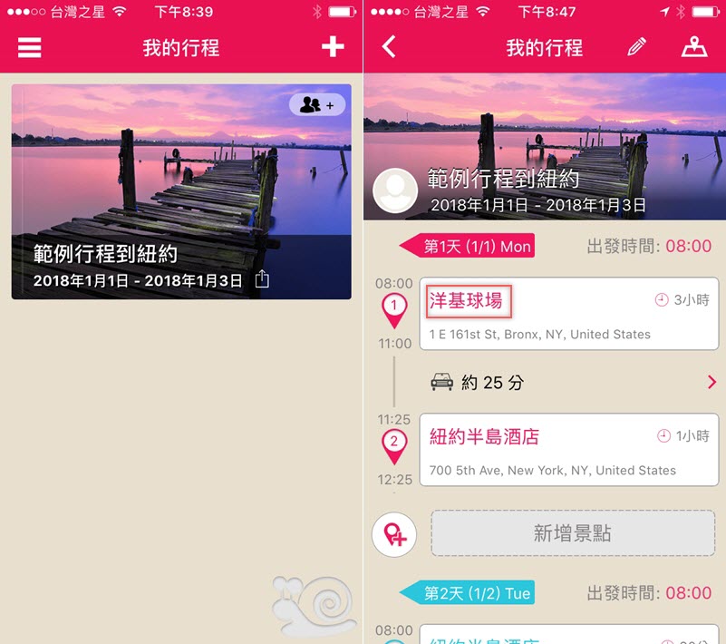 大概看了一下 iOS 版的評價與功能似乎比較好一點,所以這次阿湯用 iOS 介面來示範,開啟後先有一個已經做好的範例,點進來是三天的紐約行程。