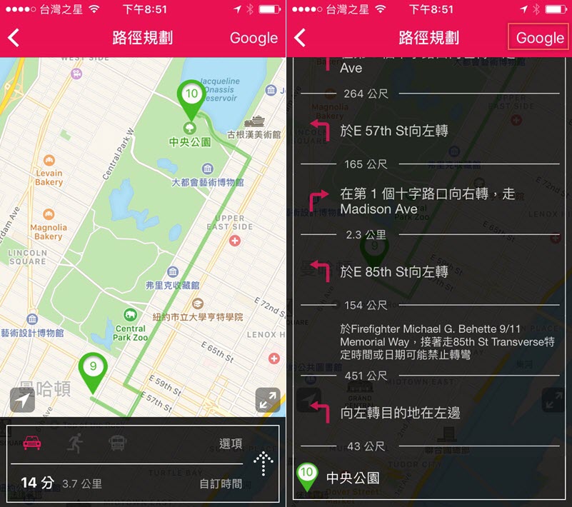 往下滑還有詳細的解說,哪個路口左右轉、要走幾公尺等等,對於路痴來講很有幫助,也可點右上角切換到 Google 地圖。