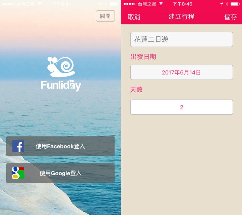 要先登入才能在首頁左上角建立行程,可用臉書或 Google 帳號,先輸入行程名稱、日期、天數。