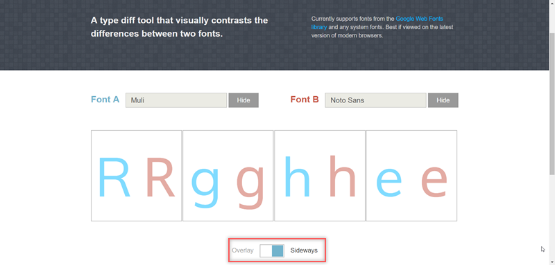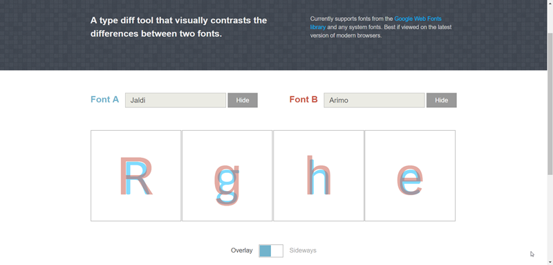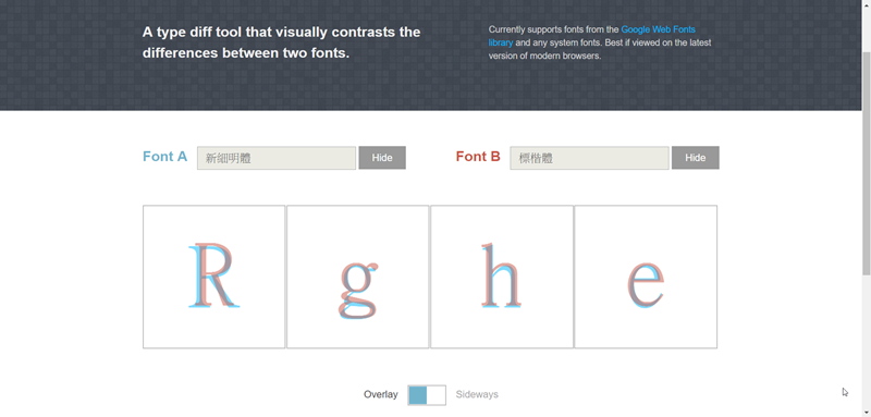 設計工作者往往需要大量收集字體,阿湯之前也介紹了不少特別的字體提供給大家使用,但除非對各種字體非常熟悉,要比較不同字體間的差異通常是用不斷切換的方式,最近阿湯發現一個好用的網站「Tiff」,輸入兩種不同字體就會以不同顏色重疊顯示,讓人一眼就能分辨出來,不必花時間看到眼花,尤其是英文字型,像阿湯這種偶爾才需要變換使用的人根本不會去記,用這個線上工具就能快速分辨出來。