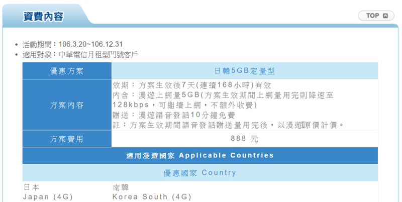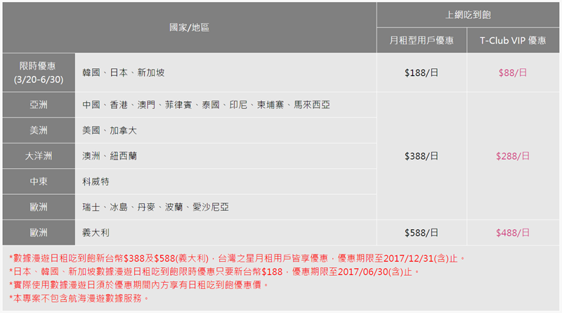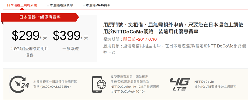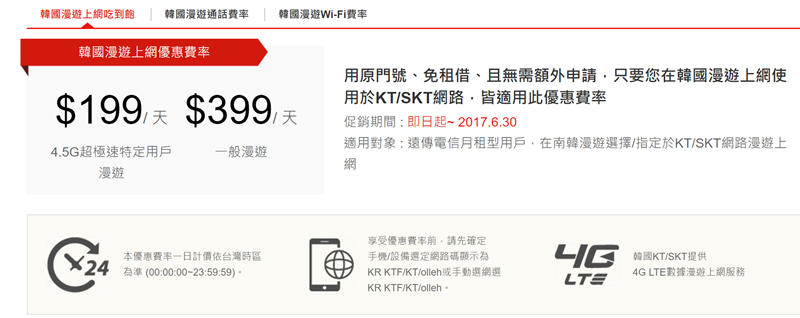 台灣之星也是很簡單,日韓旅遊到 106 年 6 月底之前有優惠活動,月租型用戶 1 日 188 元,VIP 用戶 1 日 88 元。