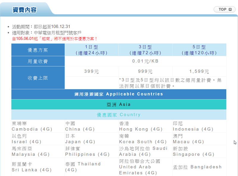亞太 4 G 漫遊日本只有 399 日租型,0.01 元 1 KB。