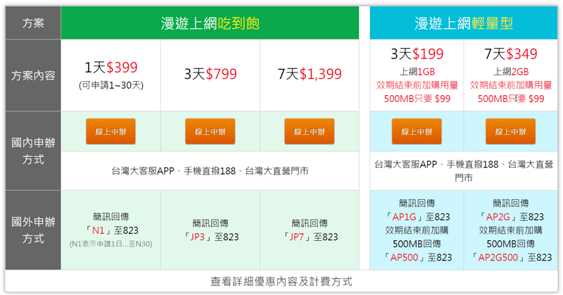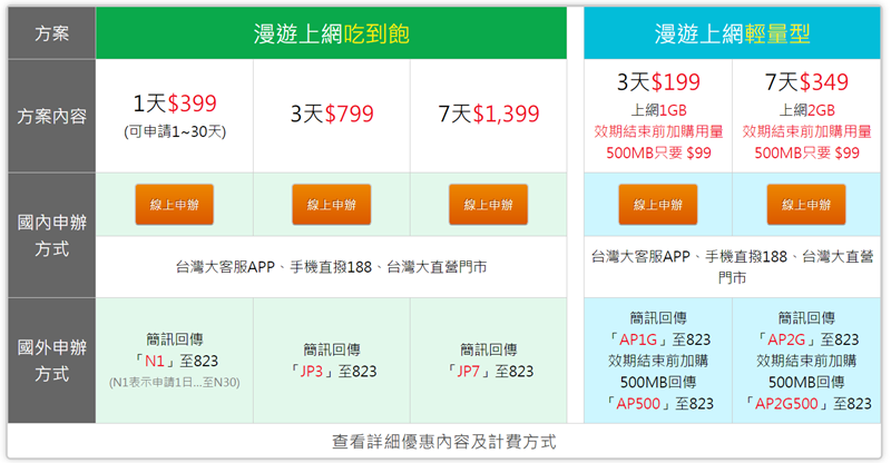 台哥大的漫遊就是分吃到飽和輕量型,吃到飽有 1 日、3 日、7 日的區別,輕量則有 3 日和 7 日,主要當然是流量的差異,如果本身有門號申辦起來就很簡便。