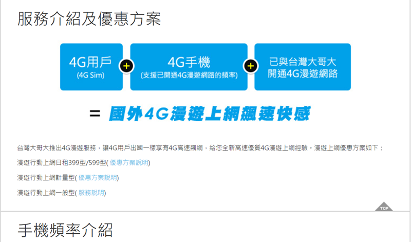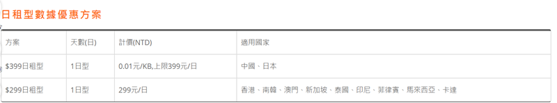 還有 4 G 漫遊上網的方案,分兩種日租費。