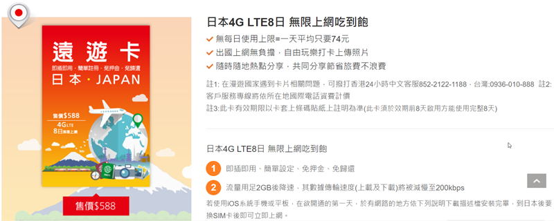 日本目前是 4 G 上網吃到飽方案,可用 8 天,每日流量無上限。