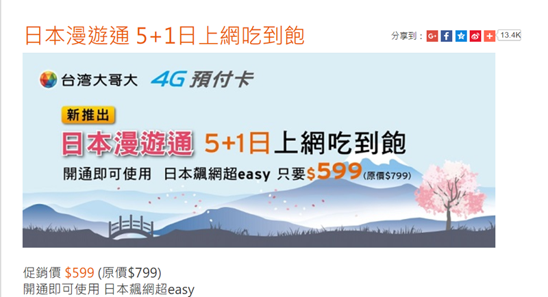 台灣大哥大的 4 G 預付卡則是 6 日 699 元吃到飽,促銷期限比日本長,到 106 年 9 月底。