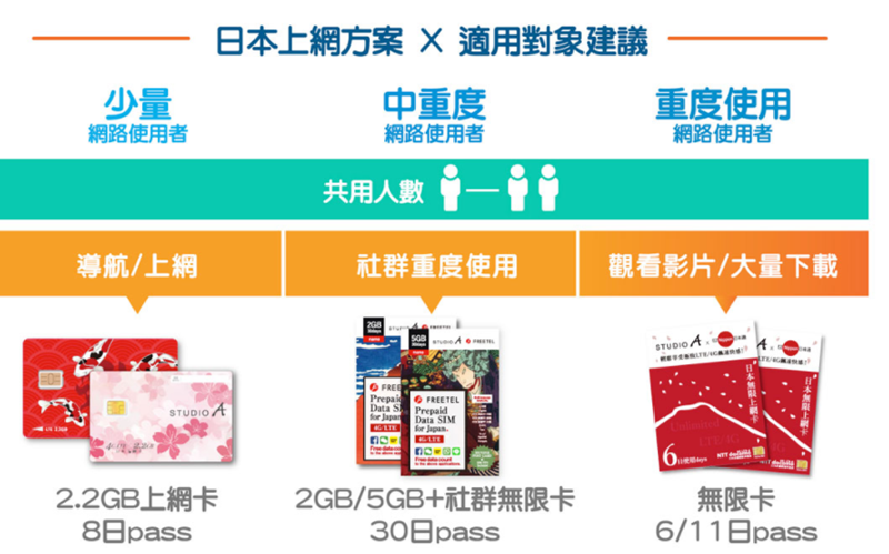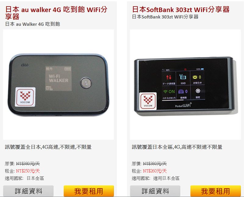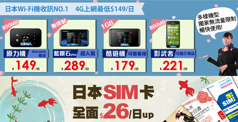 比 EZNippon 便宜,3G、4G 都有 30 天的方案,兼具通話功能的是使用 Softbank 電信,純網路則是 Docomo 電信,可搭配 Wi-Fi 機使用或加價購買。
