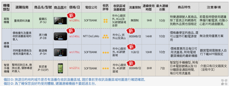 分享器的收訊與流暢度一般來說比 SIM 卡和漫遊要快,但機種眾多,尤其是日本,同機種有許多不同的租借公司,價格變動也很大,有的特價活動只有幾天,有的同名機種會改型號什麼的,如果大家要租的話記得要實際去官網再看清楚。