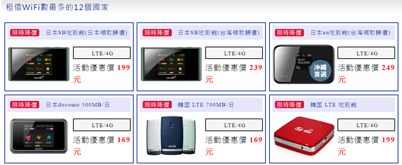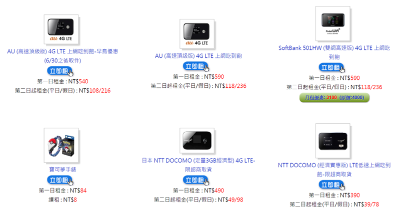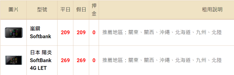 機種也很豐富,日本主要是四台機子,領取歸還的方式也有差別,像同樣一台 SB 吃到飽,日本領取歸還就比較便宜。