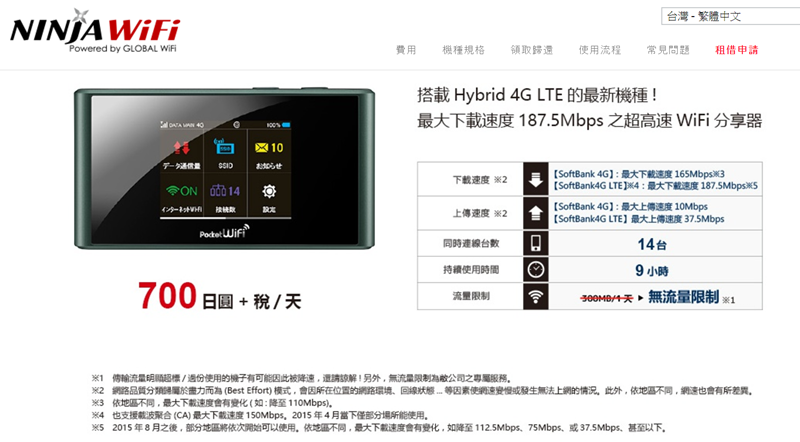 「忍者」在日本的評價也不錯,要注意的是費用以日圓計算,而且只能刷卡,所以在匯率低的時候租用比較划算,目前只有一種機器 700 日圓 ∕ 天,無流量限制。